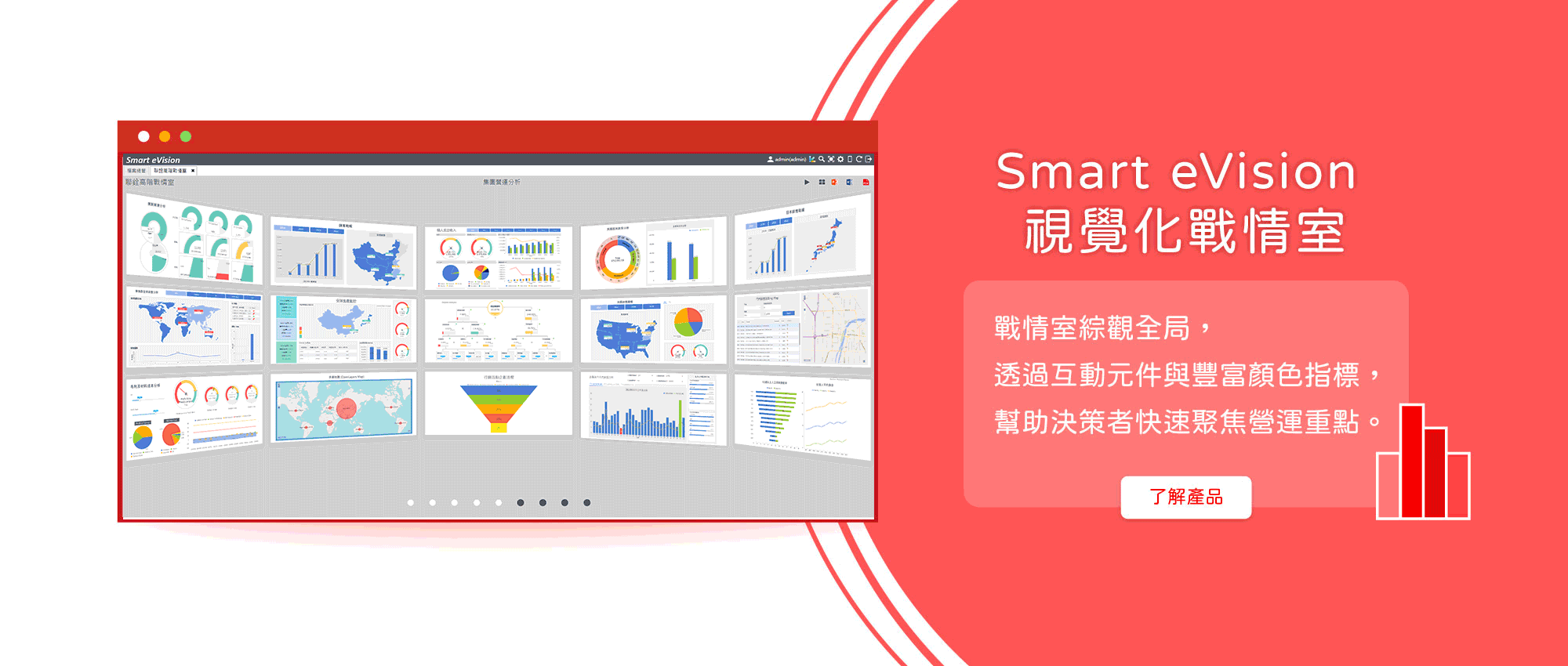 與團隊一起創建、探索和共享儀表板,透過大螢幕建造企業獨一無二的戰情室中心。