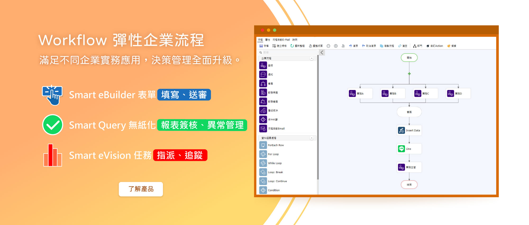 彈性設計企業內的簽核流程,例如:報表簽核流程、表單簽核流程。